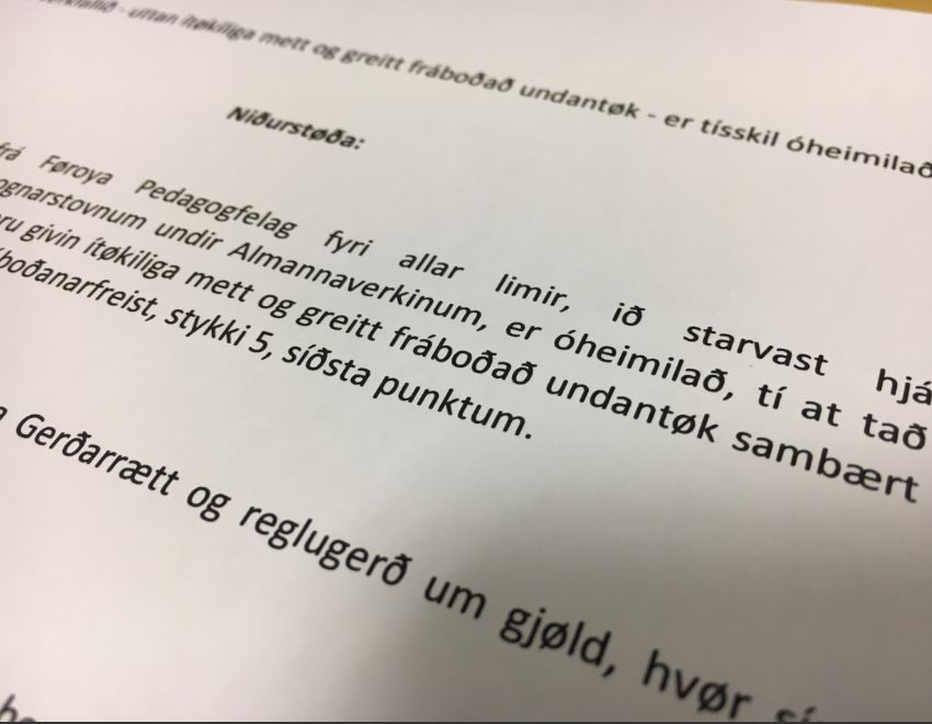 Fráboðaða verkfallið frá Føroya Pedagogfelag fyri allar limir, ið starvast hjá Almannaverkinum og sjálvsognarstovnum undir Almannaverkinum, er óheimilað, tí at tað ikki í seinasta lagi samstundis eru givin ítøkiliga mett og greitt fráboðað undantøk sambært avtaluni um fráboðanarform og fráboðanarfreist, stykki 5, síðsta punktum.