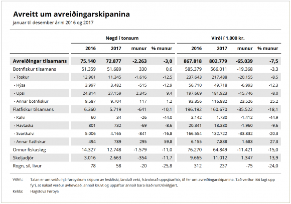 Í fjør var avreiðingarvirðið 800 milliónir krónur, og tað eru sjey prosent, ella 65 milliónir, minni enn í 2016.