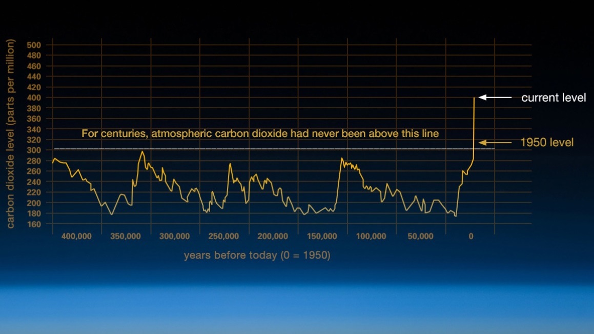 Mátingarnar vístu eitt miðal innihald av koltvísúrevnismýlum í lofthavinum á 410 ppm. Tað er tað hægsta, man veit um seinastu 800.000 árini.