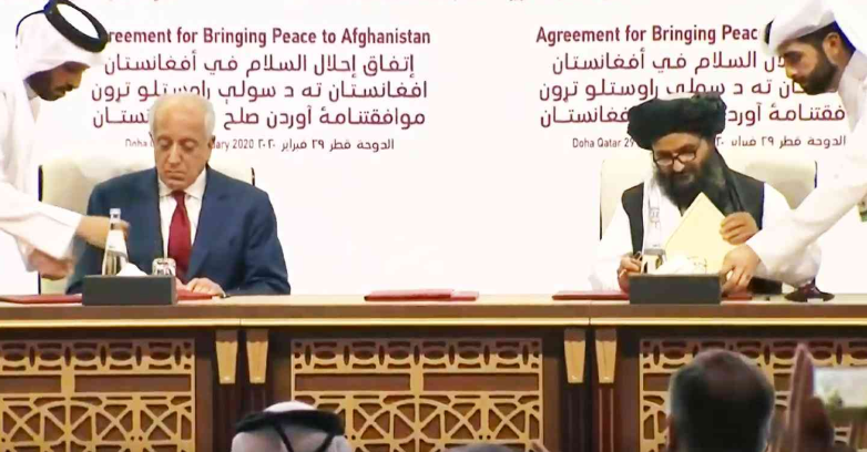 Eftir drúgvar samráðingar hava USA og hernaðarliga Taliban-rørslan í Afganistan skrivað undir friðaravtalu.
