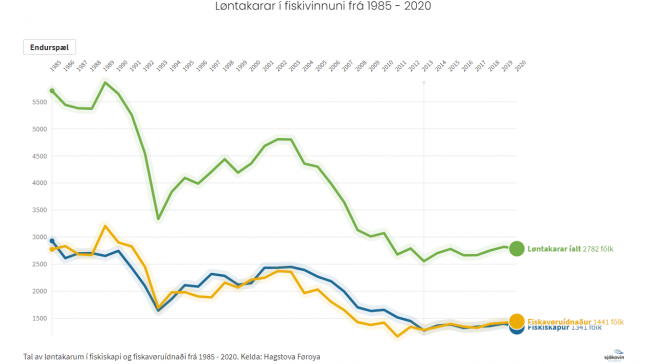 The number of workers in the Faroese fishing industry has been on a steady decline over the past 30-40 years, and the number of jobs has halved since the mid-1980s.
