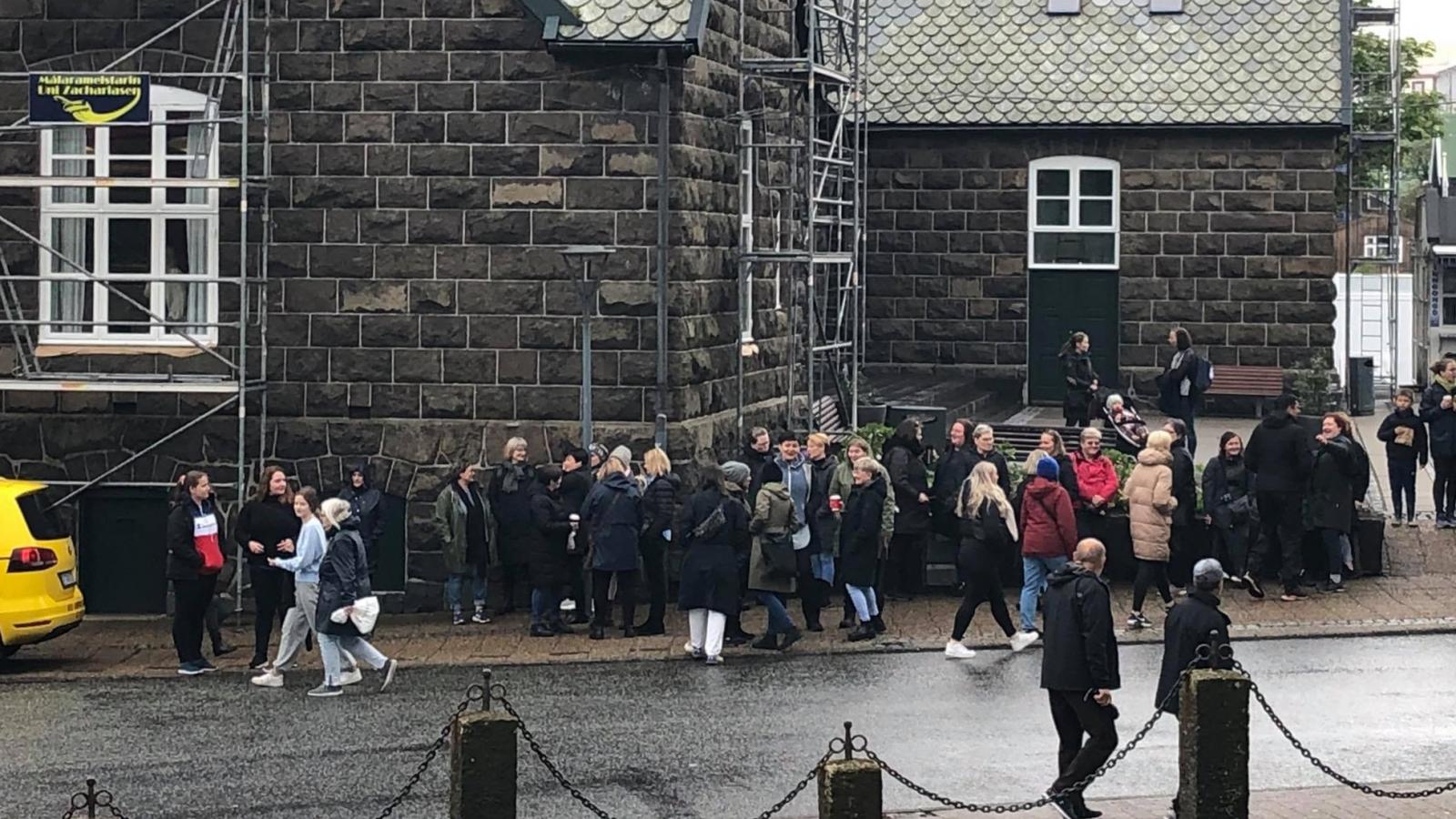 Nógv fólk eru komin saman á Vaglinum, uttan fyri Løgtingið, at mótmæla, at Helgi Abrahamsen, landsstýrismaður í arbeiðsmarknaðarmálum, ætlar at leggja fram lógaruppskot, ið skal lóggeva pedagogar innan Almannaverkið aftur til arbeiðis.