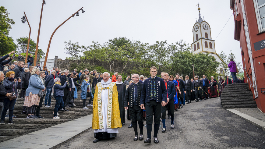 The bishop, the speaker of Parliament and the Prime Minister heading the traditional ólavsøka procession from the Parliament buildings to the cathedral and back
