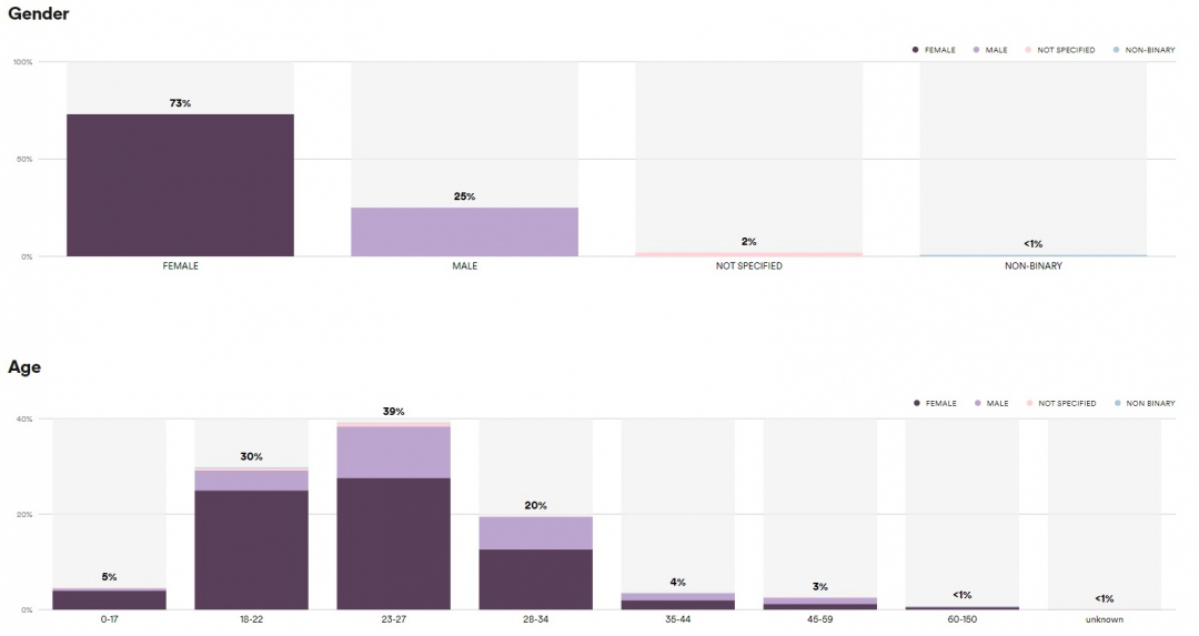 Sambært somu hagtølum hjá Spotify eru tað 39 prosent av lurtarunum, sum eru millum 23 og 27 ár. Tað merkir, at út við tríggir fjórðingar av lurtarunum hjá Gentuvesinum á Spotify eru 27 ár ella yngri.