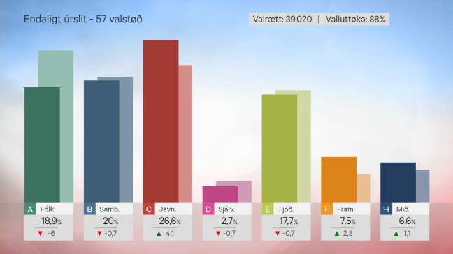 With 26.6 percent of the total vote, Javnaðarflokkurin ('C' - social democrats) won the general election by a considerable margin and now has nine seats in Parliament.