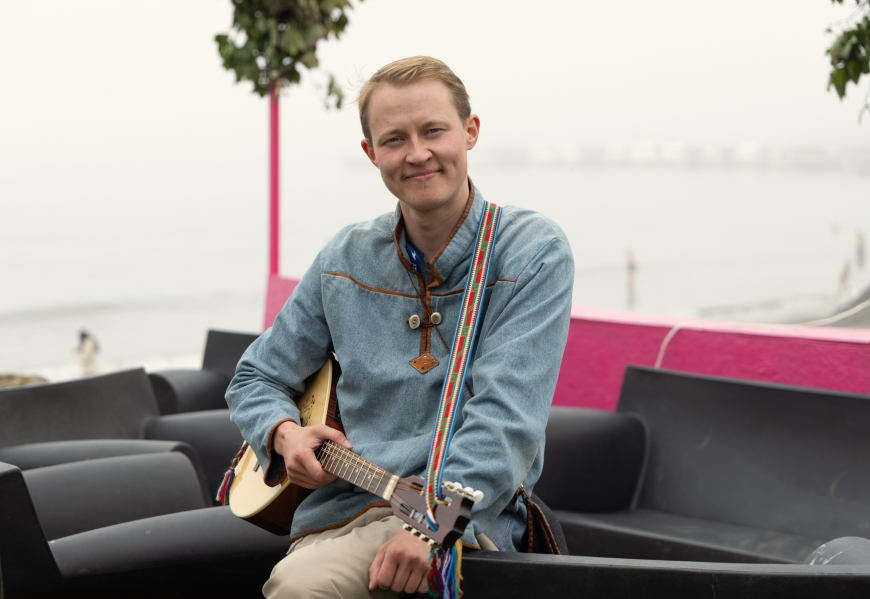 “Eg hevði hug at spæla á mandoluni. Tað eru tvey løg, sum eg plagi at spæla á henni. Annað er joikurin um vinmann mín Ørjan, og so er tað Áddjá,” sigur Emil. Tá hann sá, at nógv enn ikki vóru ordiliga vaknað, helt hann, at eitt friðarligt lag sum hetta passaði best til júst hesa løtuna.