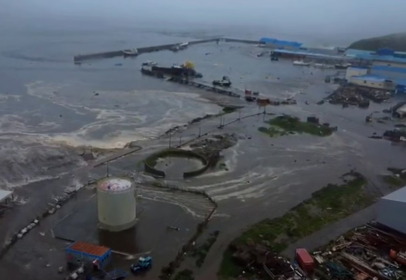 Á russisku hálvoynni Kamtjatka eru fleiri bygningar farnir í flóðalduni, men einki er frætt um, at nakar er deyður.