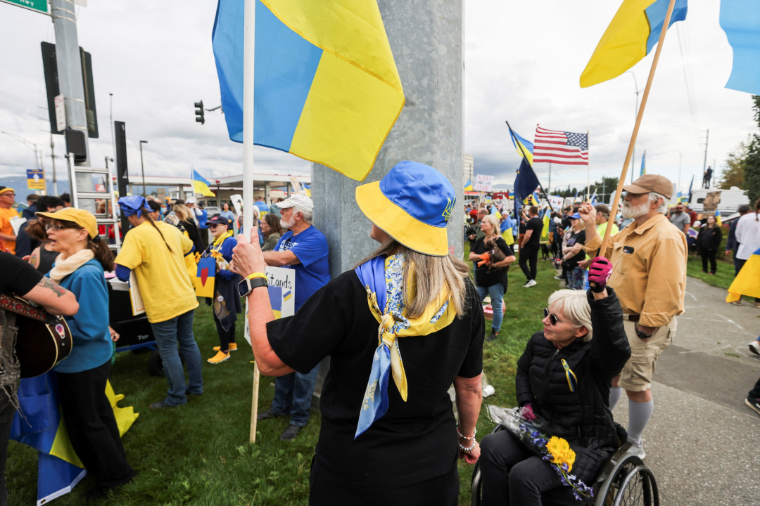 Lettiska ríkissjónvarpið, sum eisini er í Anchorage, sigur, at fleiri hundrað fólk hava gingið mótmælisgongu bæði í gjár og í dag, og ukrainsk fløgg veittra allastaðni í býnum.