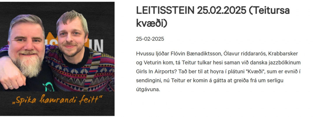 Soleiðis stóð millum annað í ummælunum av áhugaverdu plátuni "Kvæði", sum Teitur og danski indie-jazz-bólkurin Girls in Airports góvu út í november.