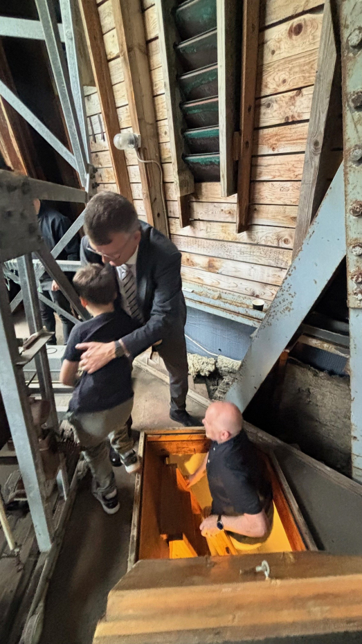 Ovast í torninum, við klokkurnar, stóð Eyðfinn Magnussen, klokkari, og gav teimum, sum høvdu tørv á tí. eina hjálpandi hond til seinastu sentimetrarnar.