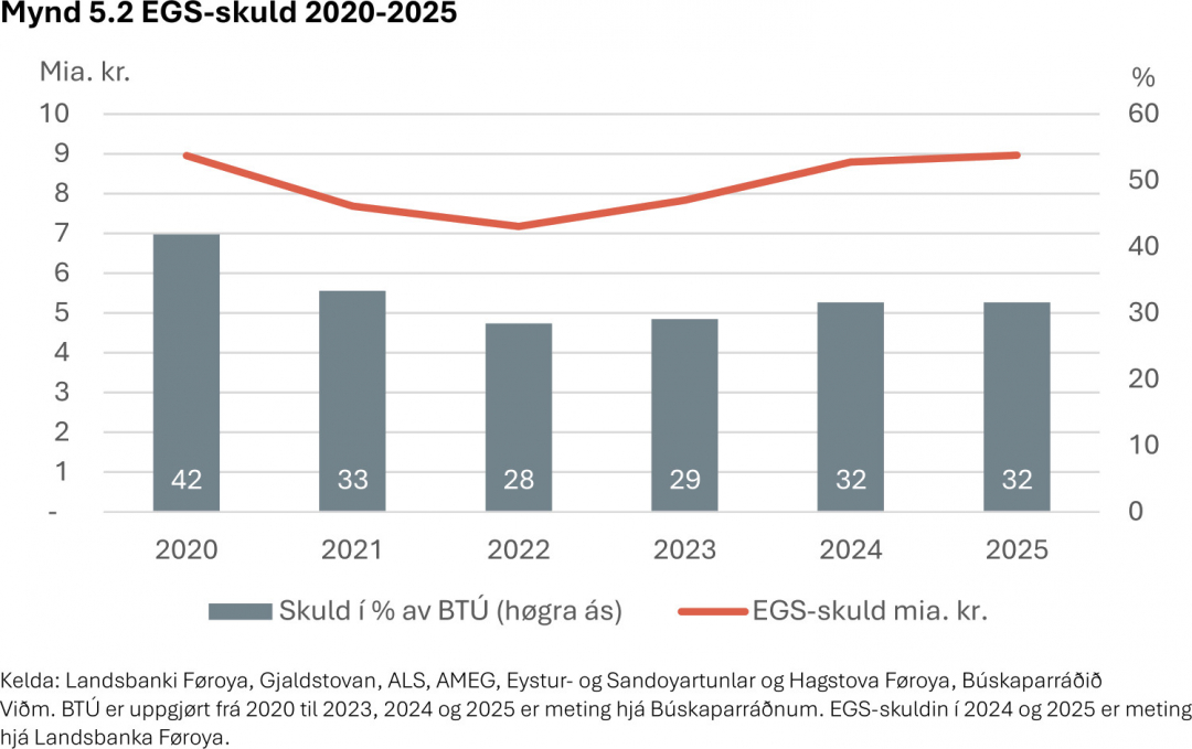 Í 2020 varð føroyska EGS-skuldin lutfalsliga høg orsakað av Covid-19. Tá var hon 42 prosent av BTÚ. Tey næstu tvey árini var hon lækkandi og kom í 2022 niður á 28 prosent. Síðan tað hevur hon tó staðið í vøkstri, og er í ár mett til 32 prosent av BTÚ.