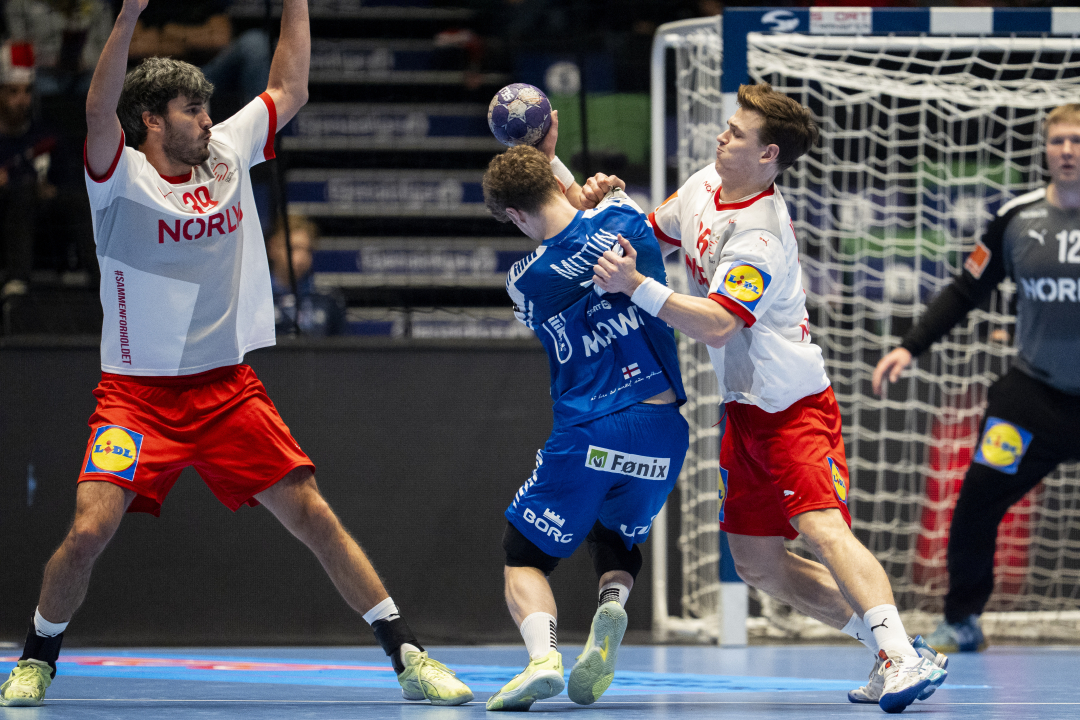 Trongstøða: Óli Mittún roynir at troka seg framvið donsku verjuni í stórtapinum fyri Danmark í Golden League (Mynd: Ole Martin Wold/NTB/Ritzau Scanpix)