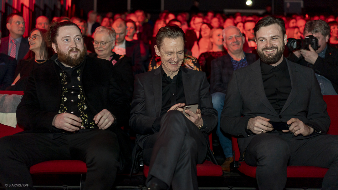 Torfinnur Jákupsson og Jón Hammer frá GRÓ Studios saman við Olaf Johannesen, sjónleikari, til frumsýningina av TROM í Løkshøll í 2022 (Mynd: Bjarni Árting Rubeksen)