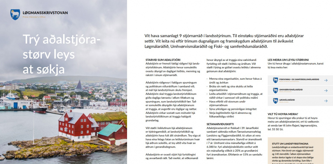 Soleiðis sá lýsingin eftir aðalstjórunum út á heimasíðuni hjá Løgmansskrivstovuni í apríl í fjør, tá søkt var eftir aðalstjórum til Løgmálaráðið, Umhvørvismálaráðið og Fiski- og samferðslumálaráðið: