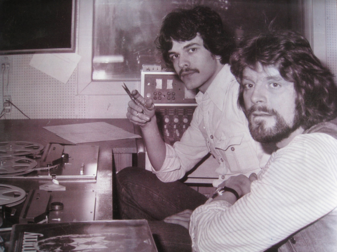 Tveir blaðungir útvarpsmenn, Carsten MacDonald Arnskov og Sonne Smith, sáli, í hølunum hjá Útvarpi Føroya undir Bryggjubakka í Havn