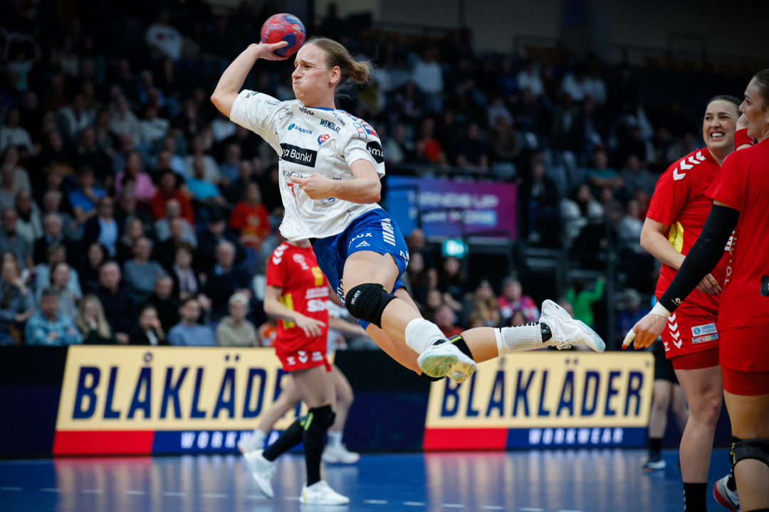 Føroyski liðskiparin á veg ígjøgnum. Tað gekk heldur misjavnt við skotunum, men í verjuspælinum riggaði samstarvið við Lív B. Zachariasen væl. (Mynd: Jure Erzen/Kolektiff)