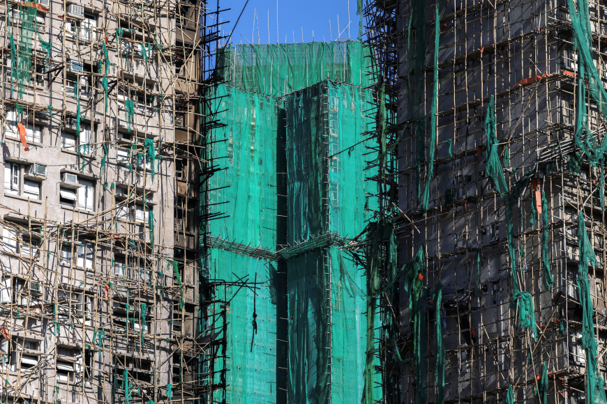 Íbúðarbygningarnir vóru m.a. klæddir við stórum plastneti, og byggipallarnir vóru úr bambus.