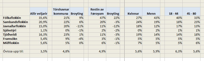 Fólkaflokkurin fær flestu atkvøðurnar frá monnum, ella 43 prosent, og 27 prosent frá kvinnum.