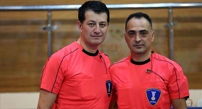 Kürşad Erdoğan og İbrahim Özdeniz úr Turkalandi døma dystin millum Føroyar og Sveis í kvøld. (Mynd: Trtspor)