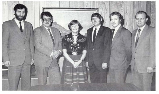 Jógvan Durhuus var varaløgmaður í landsstýrinum frá 1985 til 1989. Hini á myndini eru Atli Dam, løgmaður, og landsstýrisfólkini Jóngerð Purkhús, Vilhelm Johannesen, Lasse Klein og Niels Pauli Danielsen.