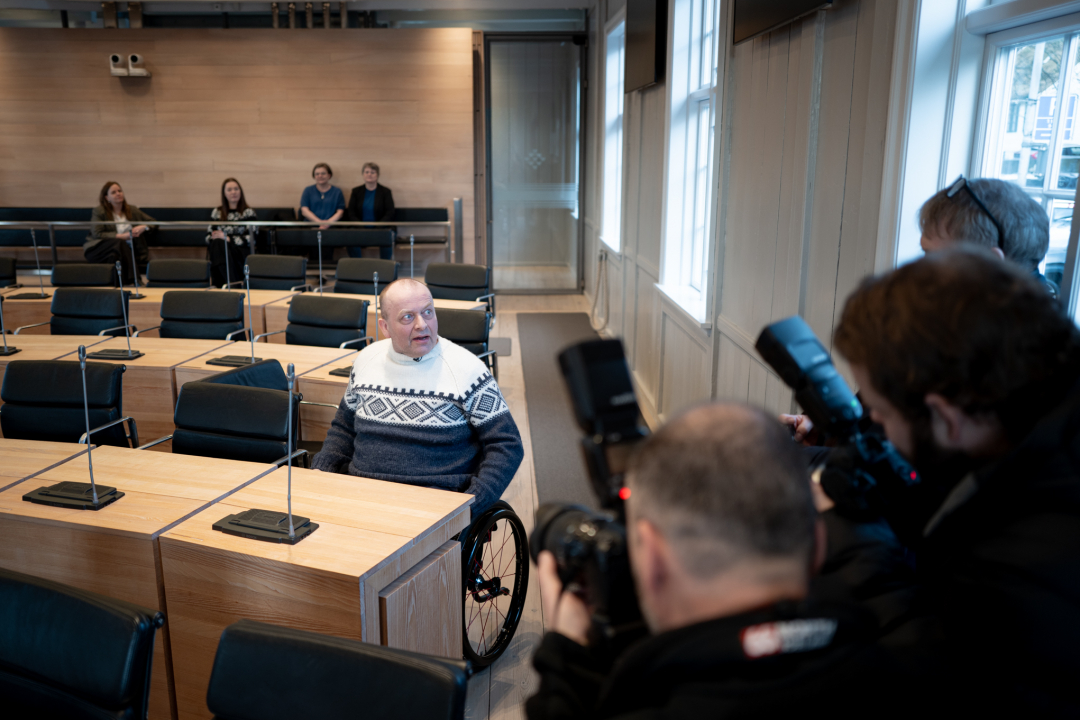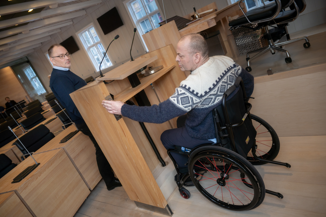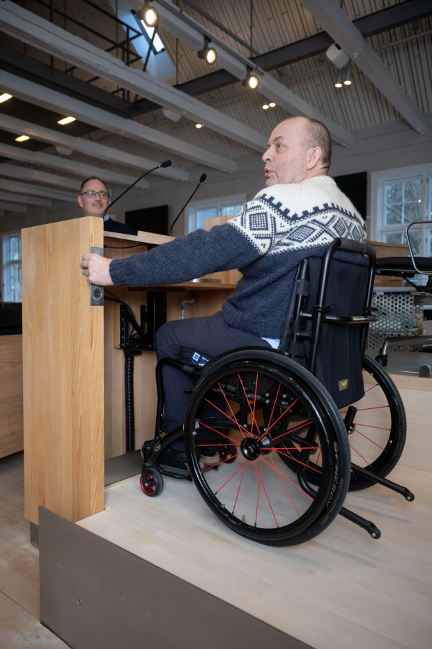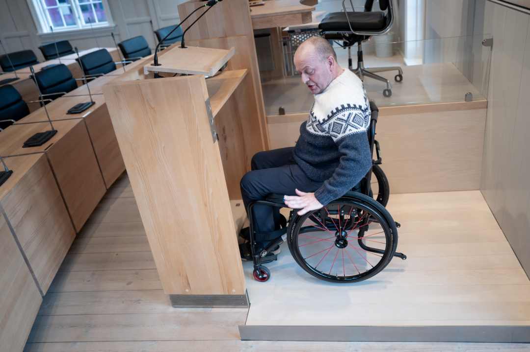 Kaj Leo Holm Johannesen, løgtingsmaður, sum er rørslutarnaður, tekur nú aftur sæti á tingi, og hann slapp at royna nýggju lyftuna í dag.