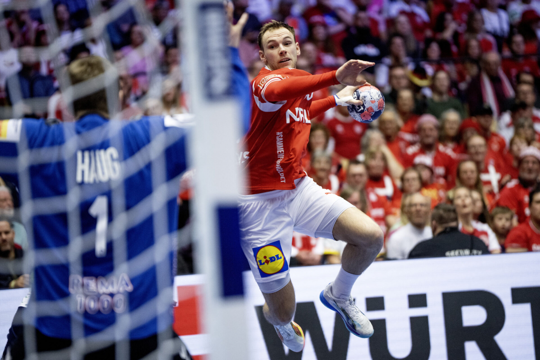 Stóra stjørnan á danska liðnum, heimsins besti spælari, Mathias Gidsel, skoraði 11 mál móti Norra (Mynd: Ritzau/Scanpix)