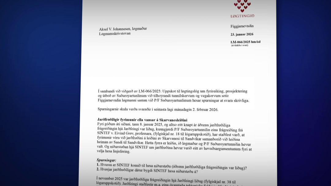 Spurningarnir koma aftrat frammanundan rúgvismikla tilfarinum til lógaruppskotið um at fyrireika, prosjektera og bjóða út Suðuroyartunnilin.
