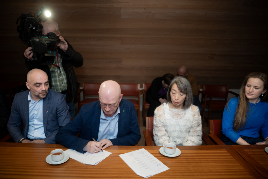 Súni Selfoss, formaður í Starvsfelagnum, og Ruth Vang, landsstýriskvinna í fíggjarmálum, tá tey høvdu skrivað undir lønarkarmin. (Mynd: Bjarni Árting Rubeksen)