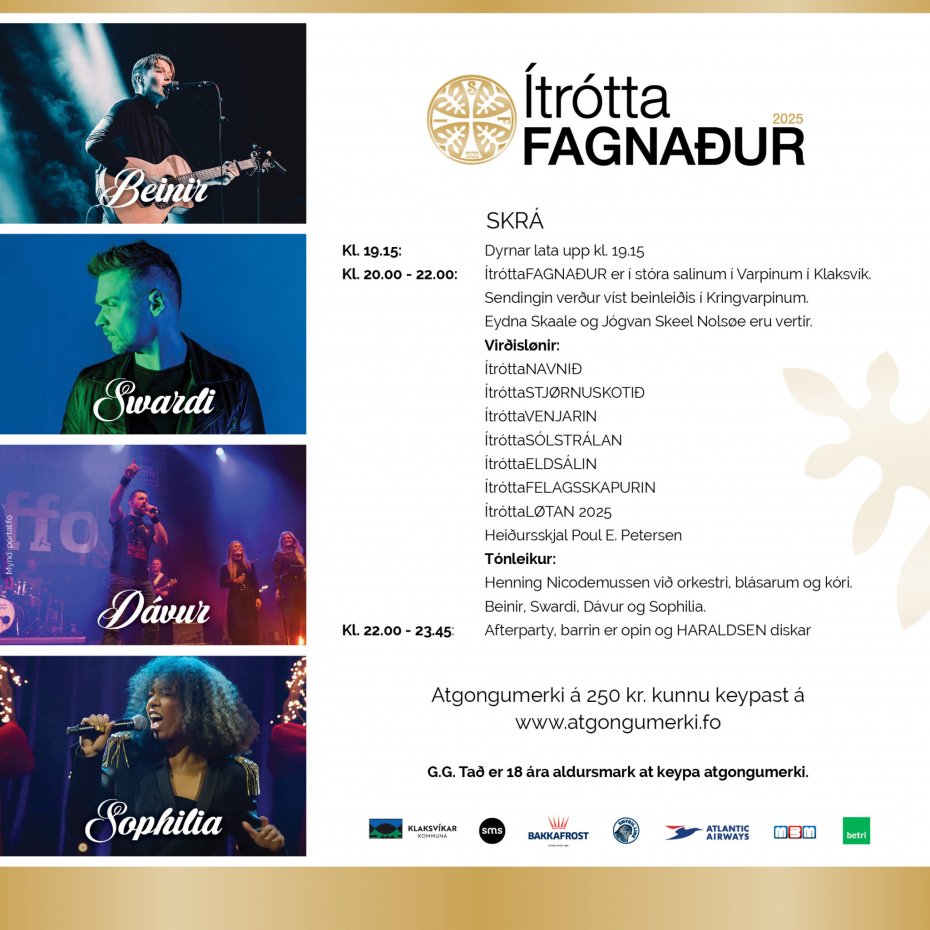 Umframt at heiðra eina rúgva av ítróttarfólkum, so vera eisini fleiri spennandi tónleikaframførslur við Beinir, Swardi, Dávur, og Sophiliu, ið er ein av spírunum í nýggju Kringvarps-tónleikarøðini "Hoydalar":
