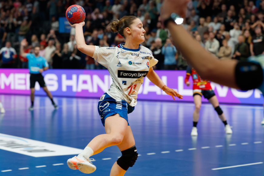 Jana Mittún tryggjar Føroyum søguliga sigurin á Spania til HM-endaspælið í vetur. Bakspælarin er Ítróttanavnið 2025