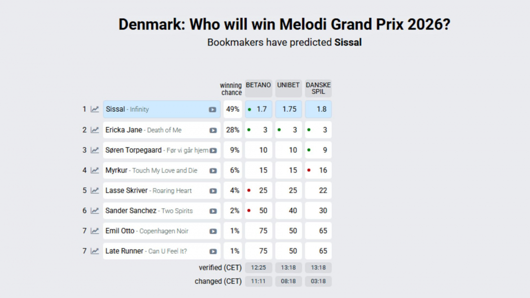 Veddingarfyritøkurnar eru ikki í iva um, at Sissal er favorittur. Inni á stóru Eurovision-fjepparasíðuni Eurovisionworld.com kanst tú eisini síggja, at Sissal er favorittur millum tey, ið hava brúka síðuna.