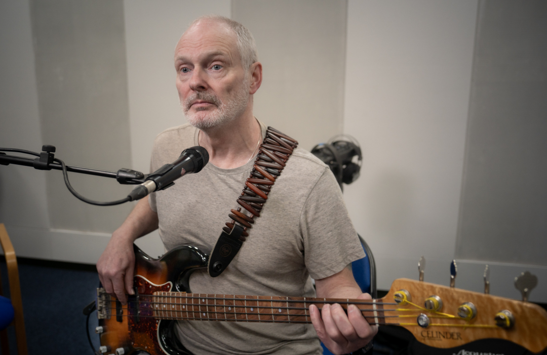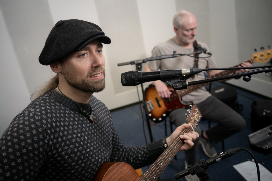 Saman við Una í Studio 5 eru Edvard Nyholm Debess á bassinum, og Finnur Hansen situr við klaverið.