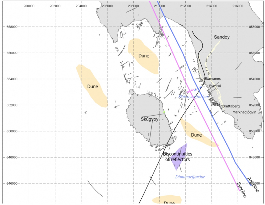 Á myndini, sum er frá jarfrøðiliga frágreiðingini frá Jarðfeingi sæst hvar faldurin gongur. Hann er millum ta ljóðsareyðu og ta bláu linjuna á kortinum.