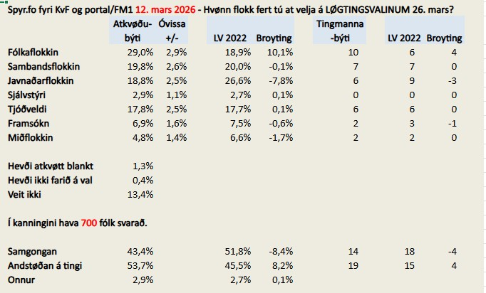 Tað vísir nýggj veljarakanning, sum spyr.fo gjørdi fyri Kringvarp Føroya og Portalin/FM1 í gjár, 12. mars.