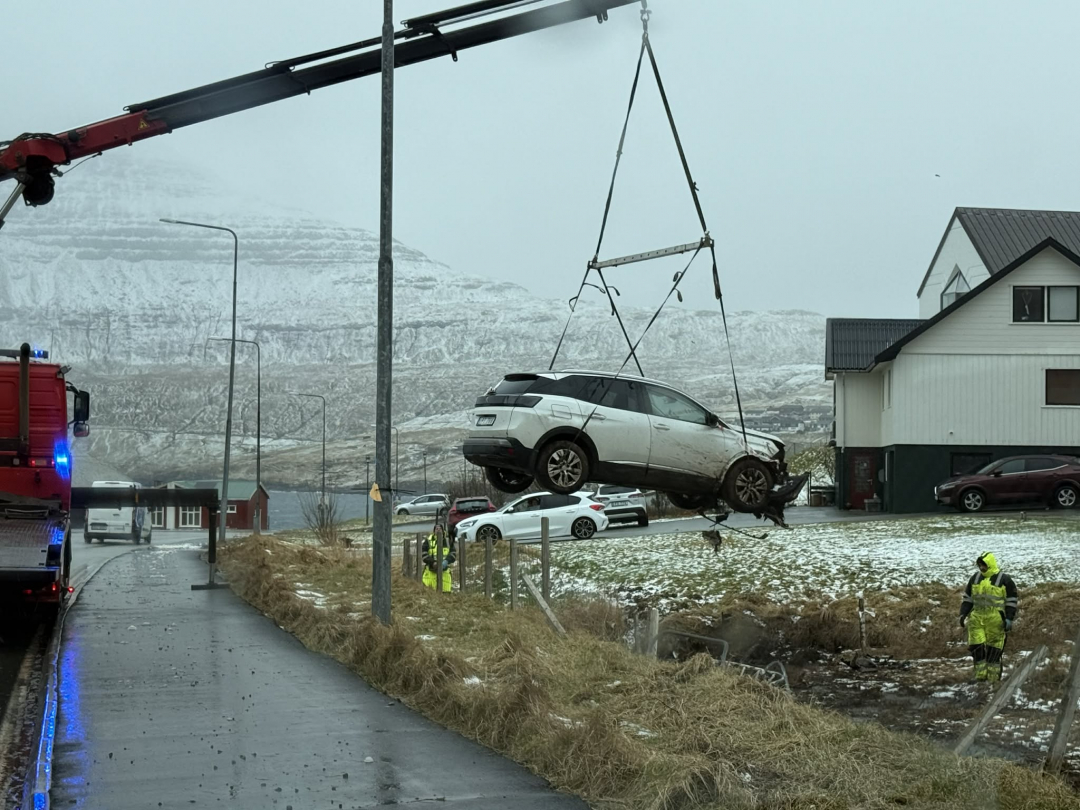 Bilurin, sum um hálvgum ellivu tíðina í gjárkvøldið fór av vegnum við Gøtugjógv, bleiv í dag tikin uppaftur.