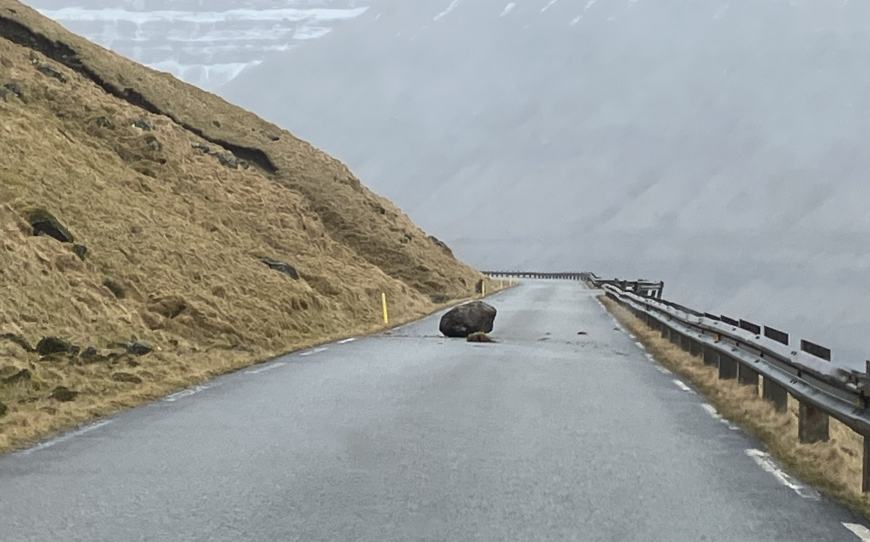 Seinnapartin í gjár datt ein stórur steinur á vegin millum Viðareiði og Hvannasund, nakað norðan fyri Hvannasund.