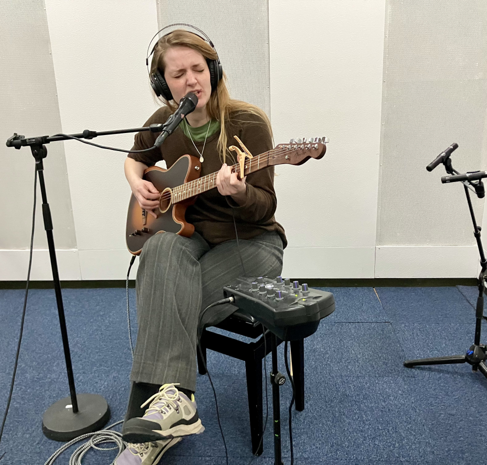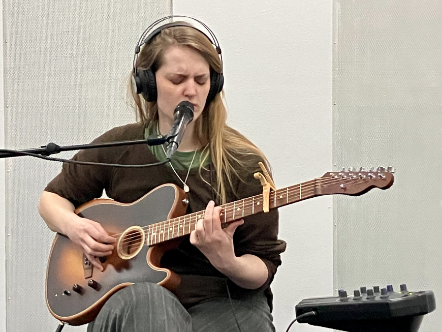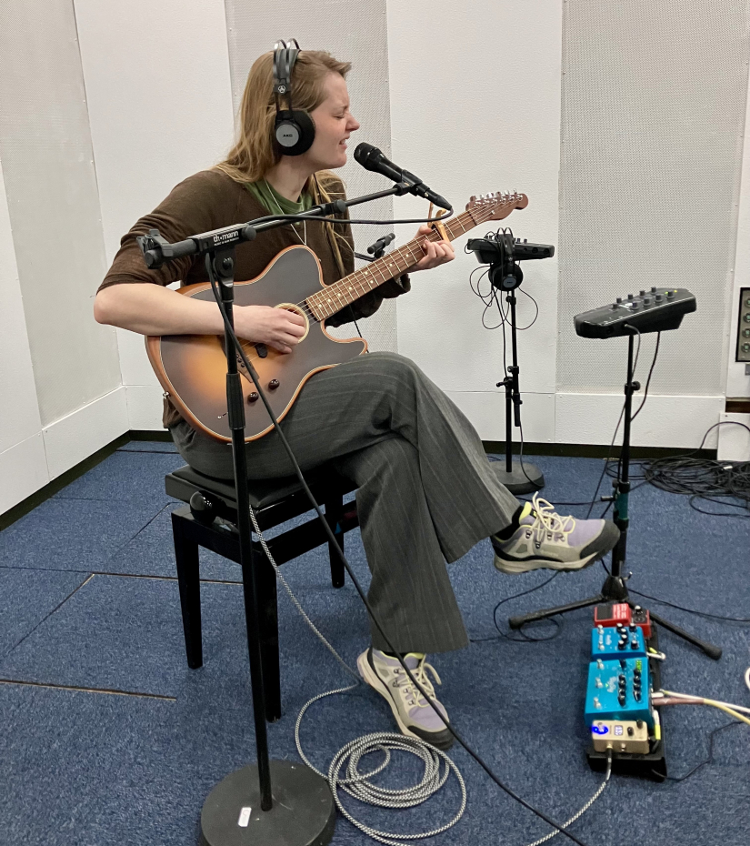 Við sær í studio hevur Ása sín Fender, ið bæði er akustiskur og elektriskur.