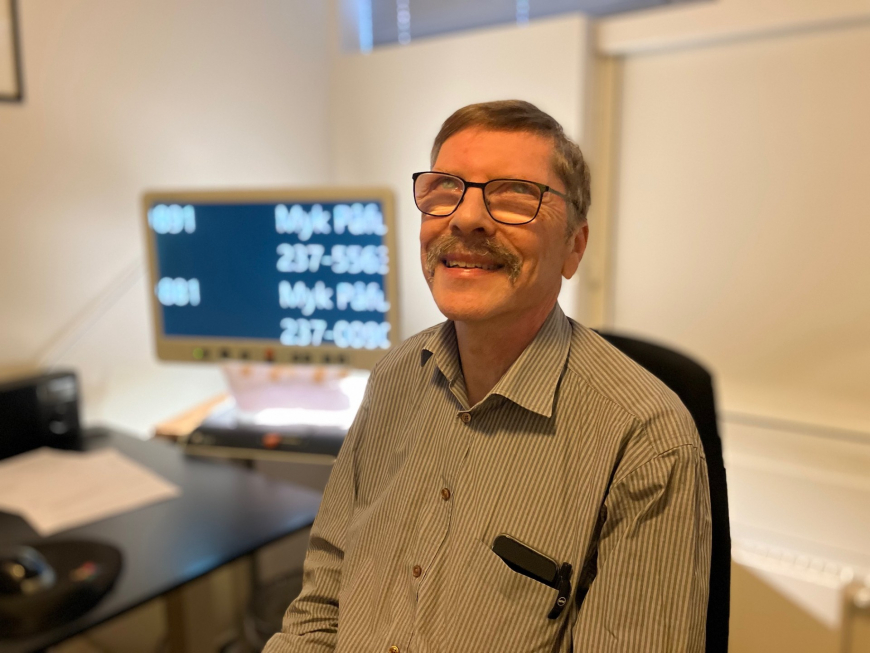 - Eg havi ymisk amboð, sum eg brúki, tá eg eri ti arbeiðis. Eg kann til dømis forstørra tekst og tøl, og eg kann eisini brúka teldutalu, soleiðis at tøl og bókstavir verða lisin upp fyri mær, sigur Johan Petur Nielsen.