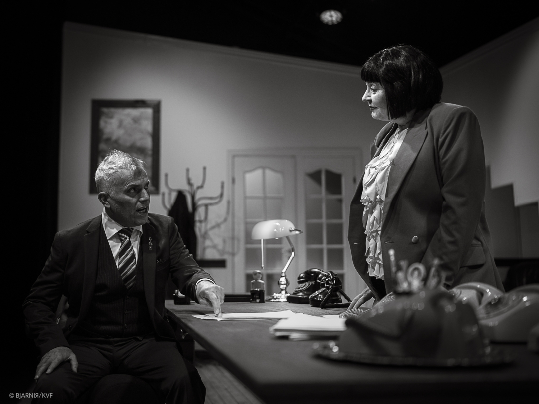 Lagið var gott, tá leikararnir í dag savnaðust í Tjóðpallinum til seinastu venjingarnar áðrenn frumsýningina í annaðkvøld. Erling Eysturoy og Kristina S. Hansen eru í essinum sum ávikavist Valdemar, løgmaður, og Magdalena, fulltrúi í Tinganesi.