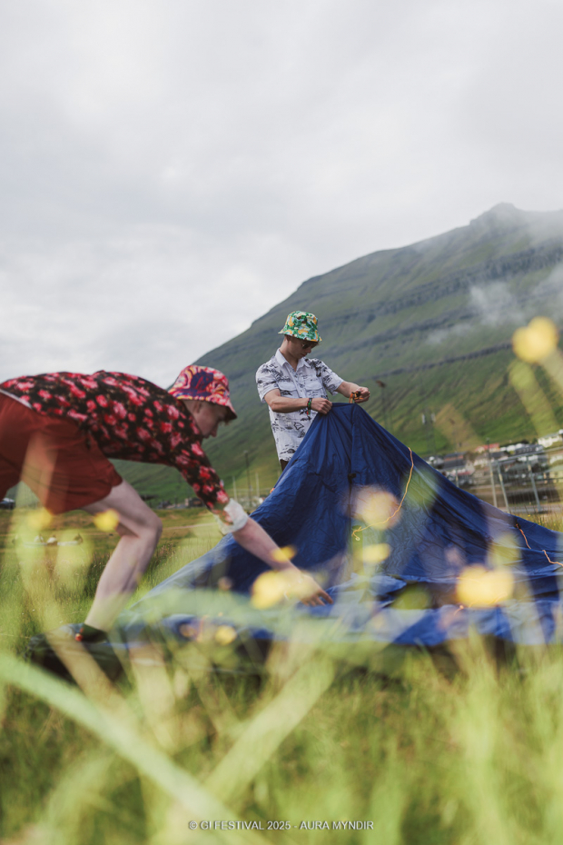Strike a pose! Tað ber væl til at gera seg eitt sindur upp fyri myndafólkinum, hóast mann er í holt við at seta eitt festivaltjald upp. (Mynd: Auramyndir)