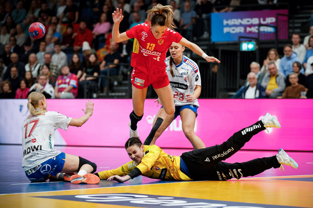 Men lítið hjálpti góða verju- og málmansspælaið, tá føroysku leikararnir við Janu Mittún og Pernille Brandenborg á odda ferð eftir ferð brendu opnar málmøguleikar. Nú var hatta við Brandenborg og at brenna meira eitt orðaspæl enn nakað annað, tí føroyski liðskiparin gekk á odda og gjørdist toppskjútti við átta málum. Men eisini hon skuldi brúka 13 skot fyri at fáa síni átta mál, og tá vóru fimm av málunum brotskøst. (Mynd: Jure Erzen / kolektiff)