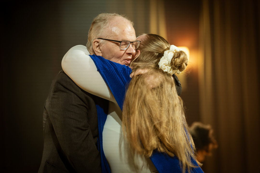 Virðing og viðurkenning millum ættarliðini. Jóhanna Sámalsdóttir og Martin Joensen hálsfevnast so hjartaliga. (Mynd: Bjarni Árting Rubeksen)