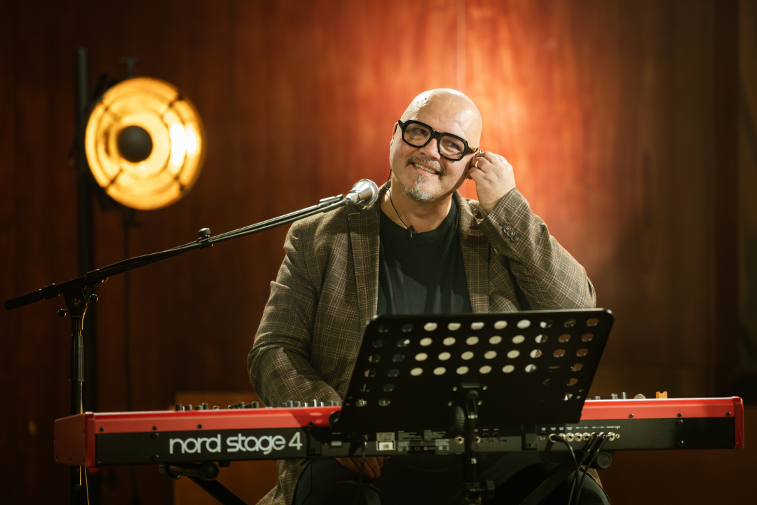 Per Zachariassen, framleiðari og mennari av Hoydalar-hugskotinum, stýrir upptøkunum við sera kønum hondum.