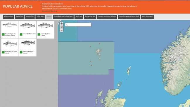 Við at trýsta á kortið, fær brúkarin atgongd til brúkaravinarligan samandrátt av tilmælinum fyri ávísan fiskastovn, umframt lívfrøðiliga heildarmynd av stovninum.