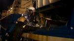Eldurin festi eisini í ein lastbil, sum stóð við síðuna av bussinum.