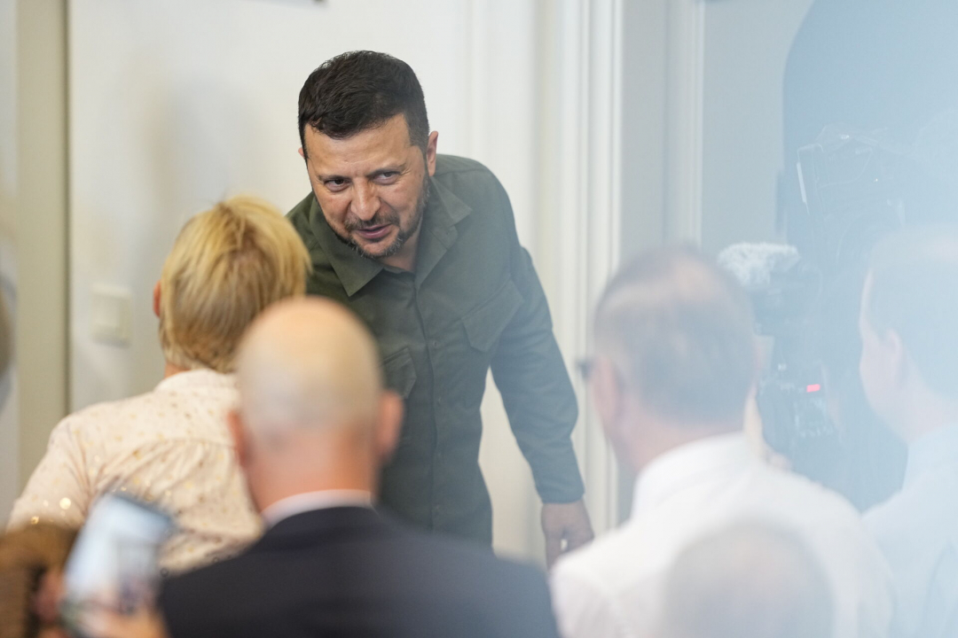 Ukrainski forsetin Volodymyr Zelenskyj kom til Danmarkar í gjár, tá hann fekk handan 19 F-16 flogfør frá danska forsætismálaráðharranum Mette Frederiksen.