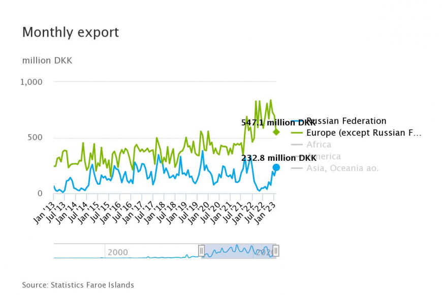 Total exports from the Faroes to Russia in February 2023 amounted to DKK 232.8 million, which is roughly the same total as just before the invasion. Source: Statistics Faroe Islands