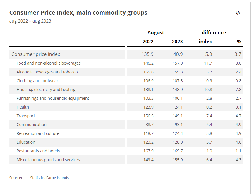 Grocery prices rose the most in the latest inflation figures from August, reports Statistics Faroe Islands.
