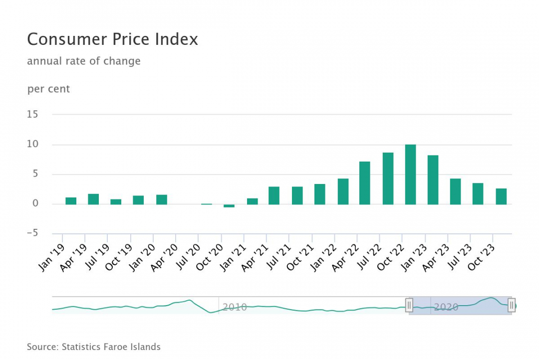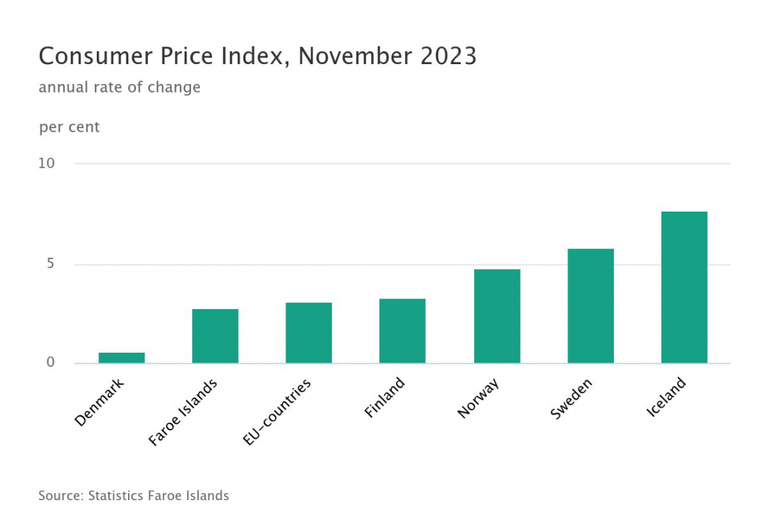 The Faroese annual inflation rate in November 2023 was somewhat lower than in the other Nordic and EU nations, with the exception of Denmark, which registered a remarkably low rate of 0.6 percent.